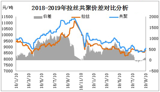 ????????2018-2019年P(guān)P拉絲、共聚在7-8月處于僵持低迷狀態(tài),業(yè)者對長期成交疲態(tài)市場看空情緒明顯加重。商家因擔(dān)憂后市,低價甩貨明顯增多。9月市場受兩油庫存快速消耗及期貨連漲支撐,市場呈現(xiàn)絕地反彈局勢,拉絲與共聚價差逐步拉開距離。目前拉絲與共聚價差已經(jīng)由原來持平狀態(tài),擴大至100-200元/噸。根據(jù)目前拉絲與共聚成本價差計算,共聚高于拉絲300-400元/噸屬于正常價差,拉絲與共聚有價差有進一步擴大趨勢。