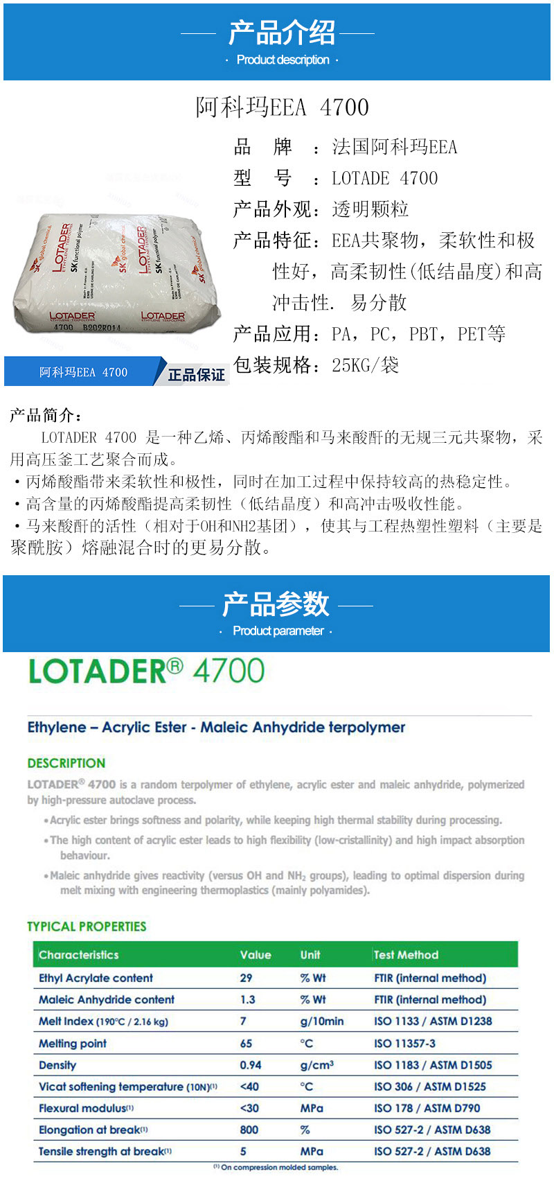 - Lotader EEA 法國阿科瑪 4700 MAH 三元共聚物 高抗沖 熱穩(wěn)定性 物性表, Lotader EEA 法國阿科瑪 4700 MAH 三元共聚物 高抗沖 熱穩(wěn)定性 產(chǎn)品參數(shù),Lotader EEA 法國阿科瑪 4700 MAH 三元共聚物 高抗沖 熱穩(wěn)定性 性能表,Lotader EEA 法國阿科瑪 4700 MAH 三元共聚物 高抗沖 熱穩(wěn)定性 出廠報告, MSDS,, 物質(zhì)安全資料表, UL黃卡,{ SGS報告, RoHS, 食品級認(rèn)證, NSF飲用水標(biāo)準(zhǔn), 產(chǎn)品資料, 產(chǎn)品性能, 出廠報告, 原廠原包, 代理商, 熱變形溫度, 熔指數(shù), 流動系數(shù), 抗沖擊性能、沖擊強度, 低溫韌性、低溫抗沖擊性能, 熔體流動系數(shù)、熔體流動速率, 加工工藝、加工參數(shù)、加工溫度, 歐盟RoHS 德國FDA 美國FDA 日本FDA