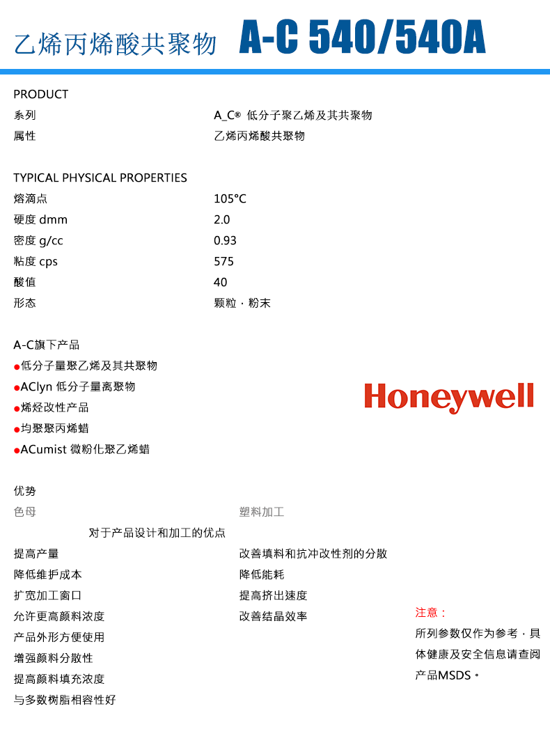 - Honeywell霍尼韋爾 A C 540 蠟粉蠟乳液 物性表, Honeywell霍尼韋爾 A C 540 蠟粉蠟乳液 產(chǎn)品參數(shù),Honeywell霍尼韋爾 A C 540 蠟粉蠟乳液 性能表,Honeywell霍尼韋爾 A C 540 蠟粉蠟乳液 出廠報告, MSDS,, 物質(zhì)安全資料表, UL黃卡,{ SGS報告, RoHS, 食品級認(rèn)證, NSF飲用水標(biāo)準(zhǔn), 產(chǎn)品資料, 產(chǎn)品性能, 出廠報告, 原廠原包, 代理商, 熱變形溫度, 熔指數(shù), 流動系數(shù), 抗沖擊性能、沖擊強度, 低溫韌性、低溫抗沖擊性能, 熔體流動系數(shù)、熔體流動速率, 加工工藝、加工參數(shù)、加工溫度, 歐盟RoHS 德國FDA 美國FDA 日本FDA