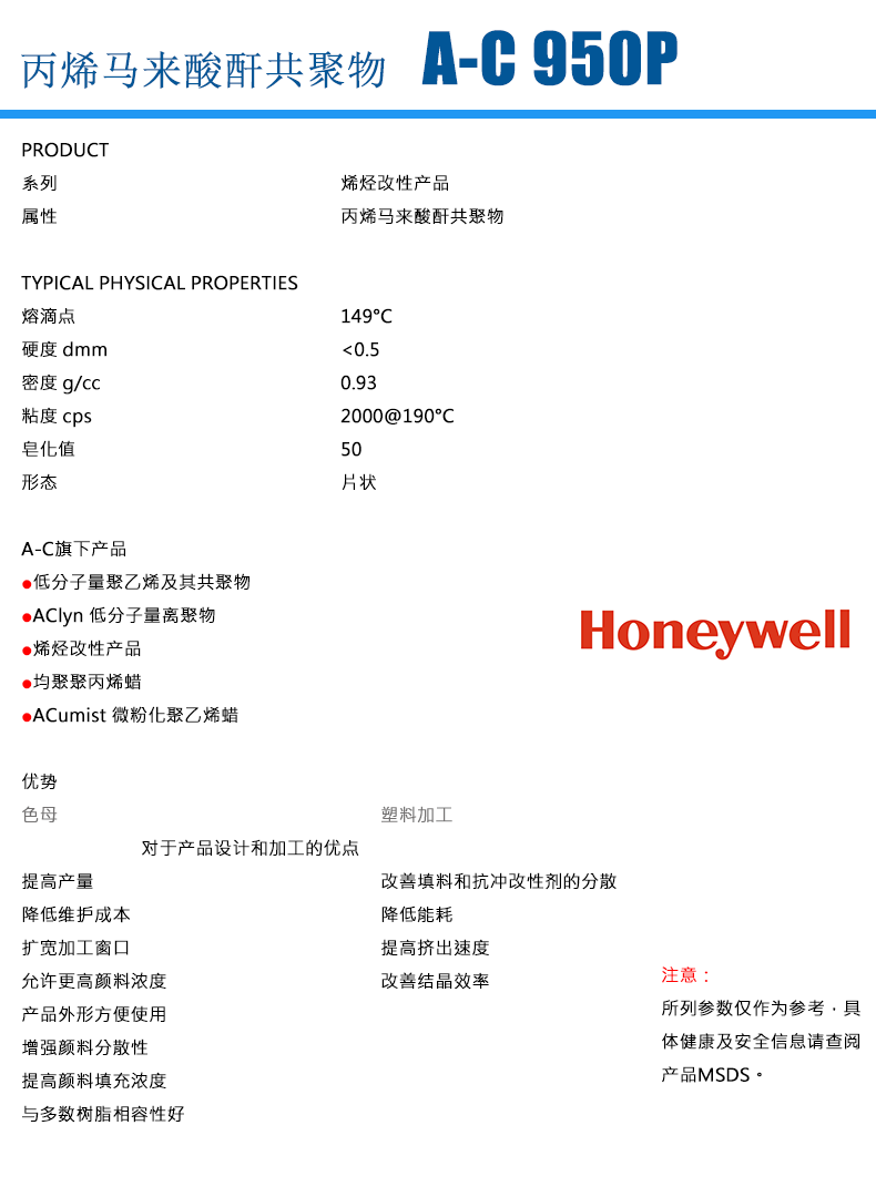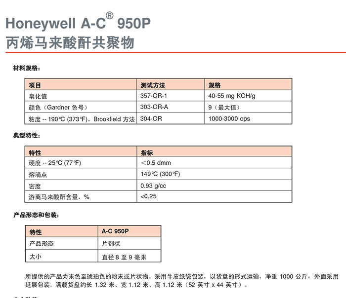 - 霍尼韋爾 honeywell 丙烯馬來酸酐共聚物 A-C 950P 適用熱熔膠電纜塑料改性 物性表, 霍尼韋爾 honeywell 丙烯馬來酸酐共聚物 A-C 950P 適用熱熔膠電纜塑料改性 產(chǎn)品參數(shù),霍尼韋爾 honeywell 丙烯馬來酸酐共聚物 A-C 950P 適用熱熔膠電纜塑料改性 性能表,霍尼韋爾 honeywell 丙烯馬來酸酐共聚物 A-C 950P 適用熱熔膠電纜塑料改性 出廠報告, MSDS,, 物質(zhì)安全資料表, UL黃卡,{ SGS報告, RoHS, 食品級認(rèn)證, NSF飲用水標(biāo)準(zhǔn), 產(chǎn)品資料, 產(chǎn)品性能, 出廠報告, 原廠原包, 代理商, 熱變形溫度, 熔指數(shù), 流動系數(shù), 抗沖擊性能、沖擊強(qiáng)度, 低溫韌性、低溫抗沖擊性能, 熔體流動系數(shù)、熔體流動速率, 加工工藝、加工參數(shù)、加工溫度, 歐盟RoHS 德國FDA 美國FDA 日本FDA