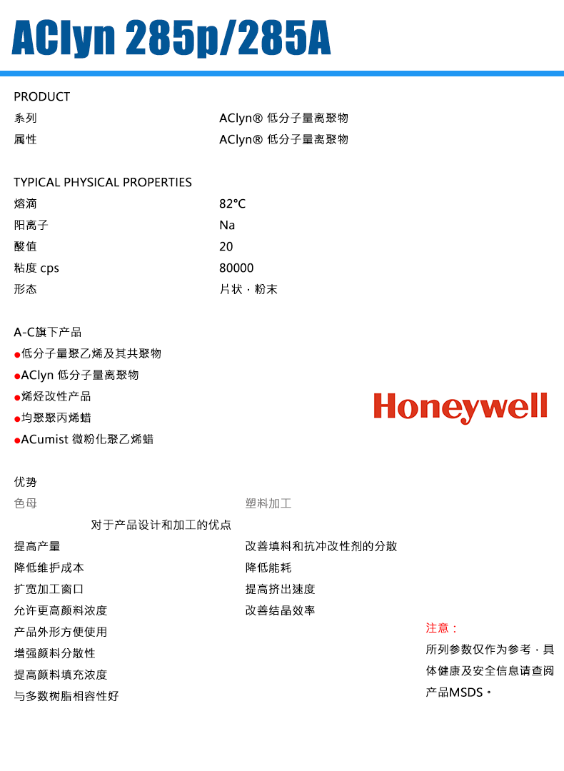 - 霍尼韋爾EAA離聚物蠟粉AClyn® 285P 結(jié)晶成核劑 物性表, 霍尼韋爾EAA離聚物蠟粉AClyn® 285P 結(jié)晶成核劑 產(chǎn)品參數(shù),霍尼韋爾EAA離聚物蠟粉AClyn® 285P 結(jié)晶成核劑 性能表,霍尼韋爾EAA離聚物蠟粉AClyn® 285P 結(jié)晶成核劑 出廠報(bào)告, MSDS,, 物質(zhì)安全資料表, UL黃卡,{ SGS報(bào)告, RoHS, 食品級(jí)認(rèn)證, NSF飲用水標(biāo)準(zhǔn), 產(chǎn)品資料, 產(chǎn)品性能, 出廠報(bào)告, 原廠原包, 代理商, 熱變形溫度, 熔指數(shù), 流動(dòng)系數(shù), 抗沖擊性能、沖擊強(qiáng)度, 低溫韌性、低溫抗沖擊性能, 熔體流動(dòng)系數(shù)、熔體流動(dòng)速率, 加工工藝、加工參數(shù)、加工溫度, 歐盟RoHS 德國(guó)FDA 美國(guó)FDA 日本FDA
