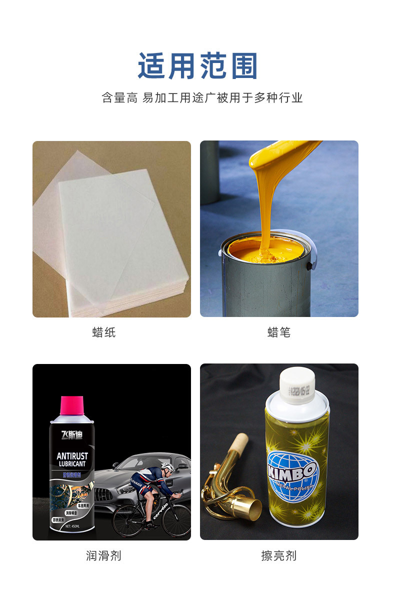 ·還適用于:蠟紙,油墨,色母粒,擦亮劑,潤滑劑,耐磨劑,五金原模等。