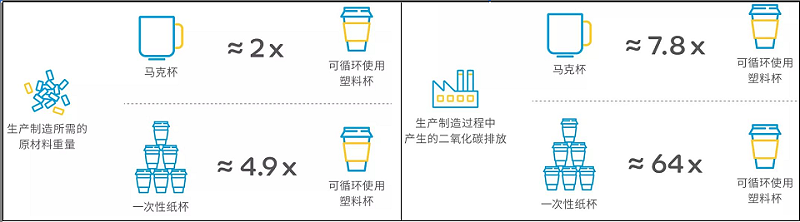 研究數(shù)據(jù)顯示:以一個(gè)普通大小的杯子為例,可循環(huán)使用的塑料杯對比馬克杯和一次性紙杯,無論在生產(chǎn)過程中的原材料損耗還是二氧化碳排放都占據(jù)優(yōu)勢。