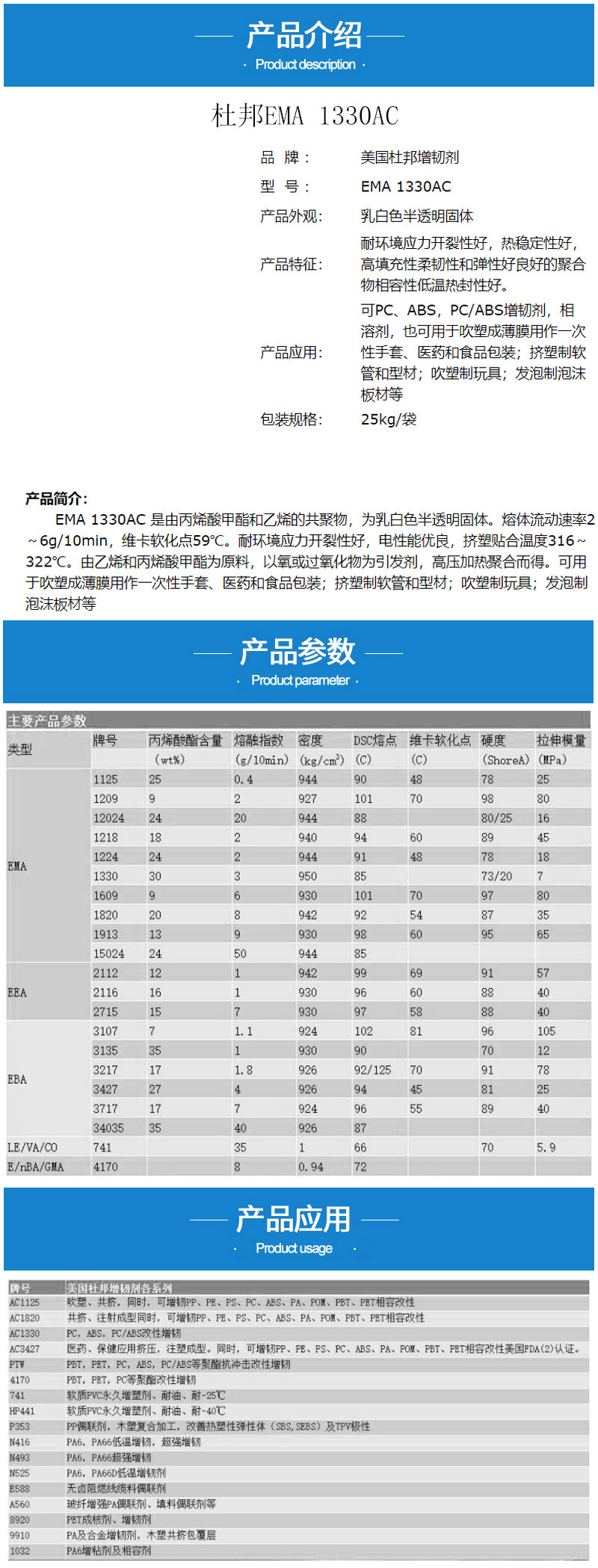 - EMA 杜邦 1330AC 相溶劑 增韌劑 注塑級(jí) 乙烯丙烯酸甲酯 美國(guó) 物性表, EMA 杜邦 1330AC 相溶劑 增韌劑 注塑級(jí) 乙烯丙烯酸甲酯 美國(guó) 產(chǎn)品參數(shù),EMA 杜邦 1330AC 相溶劑 增韌劑 注塑級(jí) 乙烯丙烯酸甲酯 美國(guó) 性能表,EMA 杜邦 1330AC 相溶劑 增韌劑 注塑級(jí) 乙烯丙烯酸甲酯 美國(guó) 出廠報(bào)告, MSDS,, 物質(zhì)安全資料表, UL黃卡,{ SGS報(bào)告, RoHS, 食品級(jí)認(rèn)證, NSF飲用水標(biāo)準(zhǔn), 產(chǎn)品資料, 產(chǎn)品性能, 出廠報(bào)告, 原廠原包, 代理商, 熱變形溫度, 熔指數(shù), 流動(dòng)系數(shù), 抗沖擊性能、沖擊強(qiáng)度, 低溫韌性、低溫抗沖擊性能, 熔體流動(dòng)系數(shù)、熔體流動(dòng)速率, 加工工藝、加工參數(shù)、加工溫度, 歐盟RoHS 德國(guó)FDA 美國(guó)FDA 日本FDA