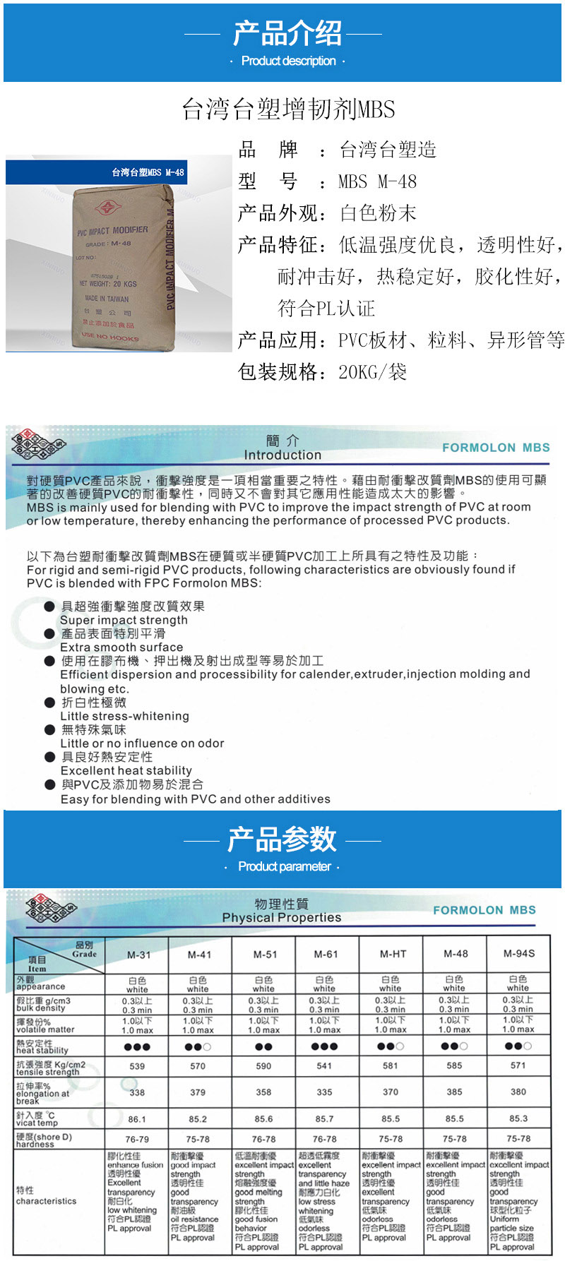 - 臺塑造MBS M48低溫強度好 透明MBS48 耐沖擊 PVC異形管增韌劑M-48 物性表, 臺塑造MBS M48低溫強度好 透明MBS48 耐沖擊 PVC異形管增韌劑M-48 產(chǎn)品參數(shù),臺塑造MBS M48低溫強度好 透明MBS48 耐沖擊 PVC異形管增韌劑M-48 性能表,臺塑造MBS M48低溫強度好 透明MBS48 耐沖擊 PVC異形管增韌劑M-48 出廠報告, MSDS,, 物質(zhì)安全資料表, UL黃卡,{ SGS報告, RoHS, 食品級認(rèn)證, NSF飲用水標(biāo)準(zhǔn), 產(chǎn)品資料, 產(chǎn)品性能, 出廠報告, 原廠原包, 代理商, 熱變形溫度, 熔指數(shù), 流動系數(shù), 抗沖擊性能、沖擊強度, 低溫韌性、低溫抗沖擊性能, 熔體流動系數(shù)、熔體流動速率, 加工工藝、加工參數(shù)、加工溫度, 歐盟RoHS 德國FDA 美國FDA 日本FDA